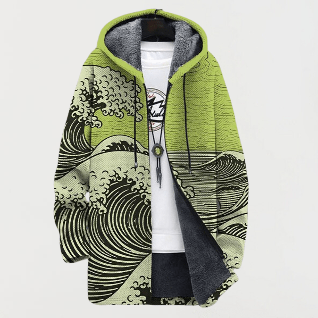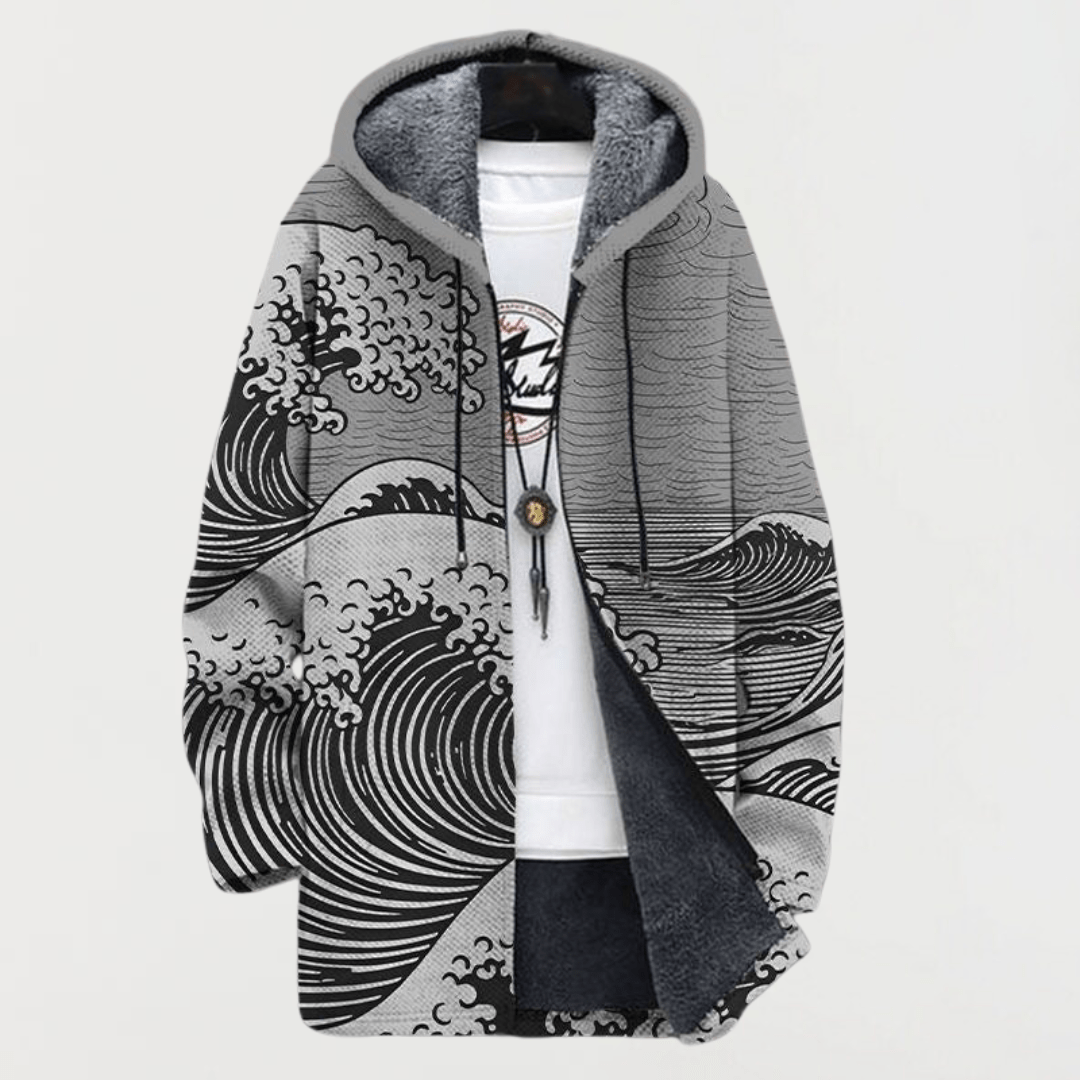 Um impressionante casaco com capuz que se destaca graças ao design inspirado nas ondas do mar. A representação artística confere dinamismo e movimento, enquanto a sua linha confortável o torna ideal para uso diário. Combina estilo e praticidade de uma forma única.