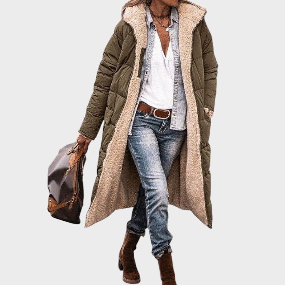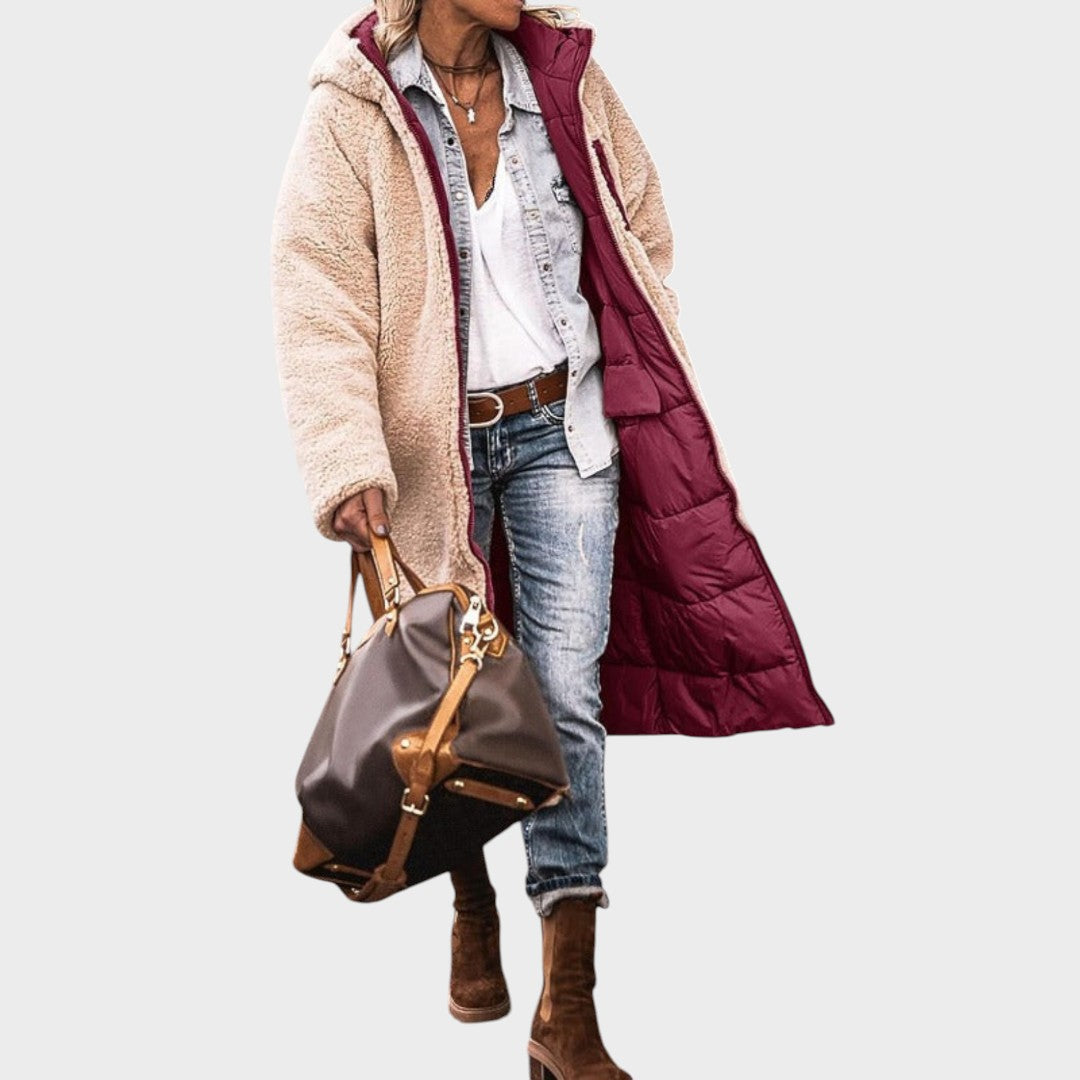 Descubre la combinación perfecta de comodidad y estilo con la chaqueta reversible Camélia. Este abrigo largo es tu aliado ideal para los días y las noches más fríos: cálido, cómodo e irresistiblemente elegante. Ofrece doble elegancia gracias a su diseño reversible, además de una calidez y suavidad incomparables.