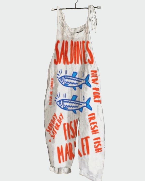 O Fish Market é um macacão único e divertido que lembra um pôster vintage de mercado de peixe. Os detalhes marcantes em vermelho e azul com as palavras “SARDINES”, “FRESH FISH”, “FISH MARKET”, combinados com gráficos de peixes, criam um visual intenso e exclusivo.