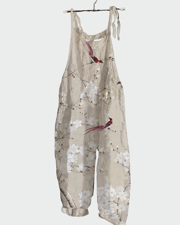 A "Primavera em Forma" é um macacão que exala elegância e romantismo. O tom bege terroso combinado com as flores brancas e os pássaros cria uma sensação de frescor e harmonia com a natureza.