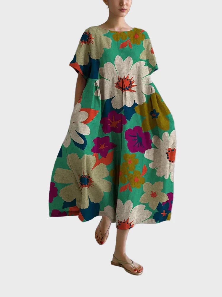 O Jardim Florido é um vestido que transmite alegria e vitalidade. Com fundo verde e grandes flores em cores vivas, é a peça ideal para destacar-se em qualquer ocasião de verão.