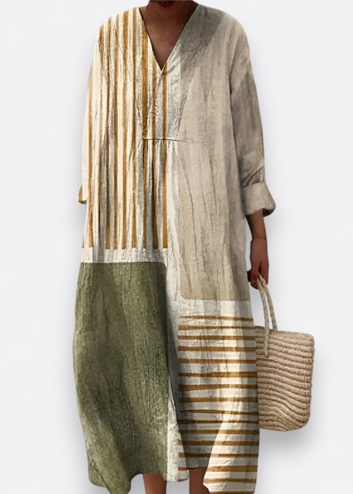 Descobre uma verdadeira obra-prima em forma de vestido. O Imelda combina padrões geométricos sofisticados com um corte fluido que valoriza qualquer silhueta. Perfeito para ocasiões especiais ou para dar um toque ousado e moderno ao teu dia a dia. Com conforto premium e um estilo que não passa despercebido, este vestido é tudo menos comum.