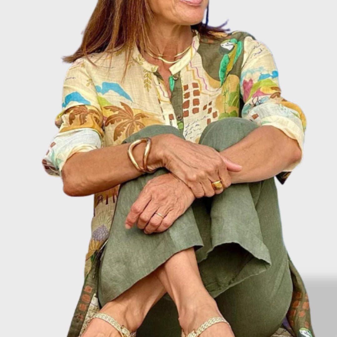 Fluidez, leveza e uma sofisticação descontraída definem o conjunto Inês™. Feito em linho natural e com um design inspirado no espírito tropical, este look é a escolha perfeita para dias de sol, encontros ao ar livre ou viagens com estilo. A sobrecamisa estampada e a calça de corte amplo criam um equilíbrio entre conforto e charme que não passa despercebido.