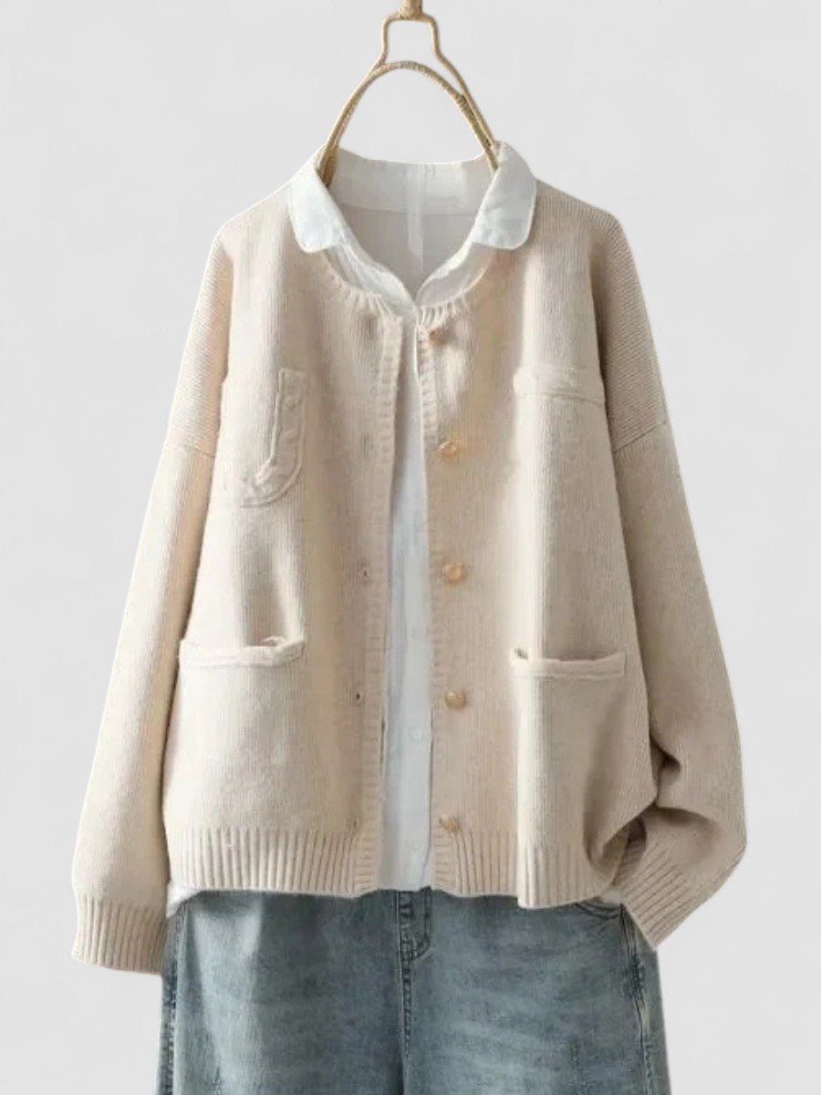O Cardigã Elegante Marcela foi criado para mulheres que apreciam a subtileza da elegância no dia a dia. Com o seu tom rosado suave, corte descontraído e detalhes cuidadosamente trabalhados nos bolsos, oferece charme e funcionalidade em igual medida — perfeito para sobrepor sobre blusas, acrescentar calor a looks casuais ou dar um toque de graça ao seu guarda-roupa diário.
