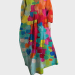 Torne-se o centro das atenções com este deslumbrante vestido midi, decorado com um padrão abstrato colorido que lembra uma obra de arte. O seu corte solto proporciona conforto, enquanto o decote em V e as mangas três quartos conferem elegância e feminilidade. Ideal para saídas de verão com um estilo único.