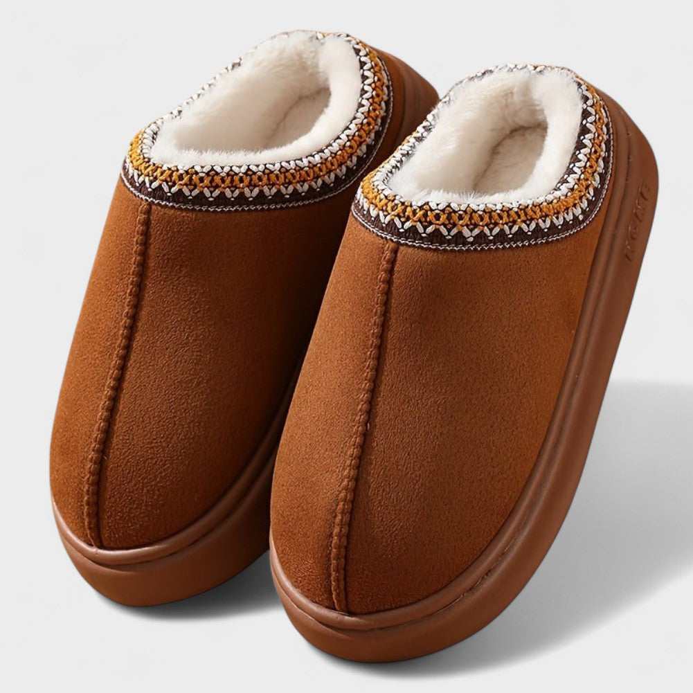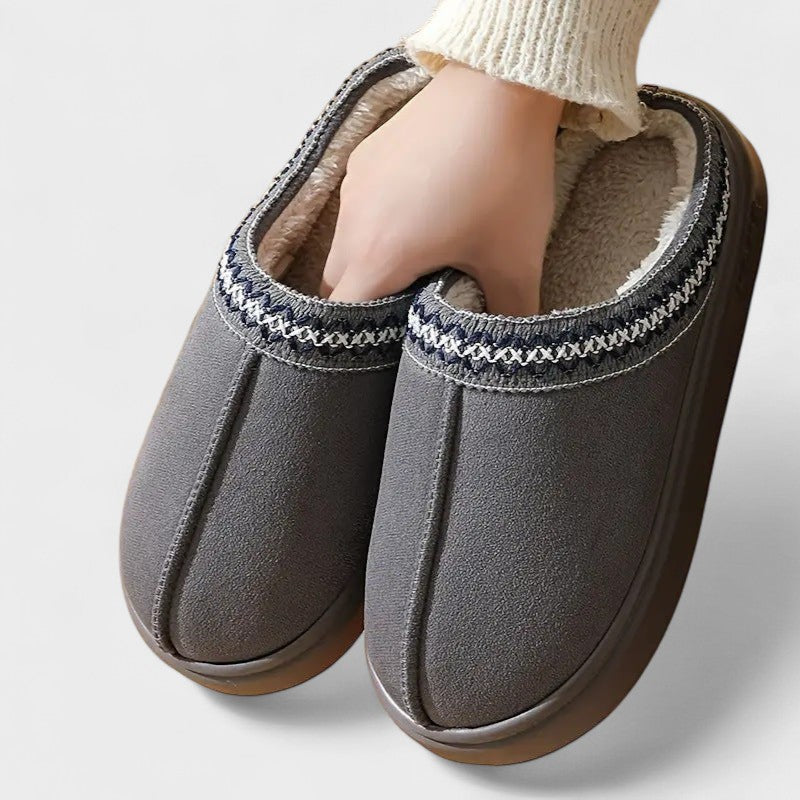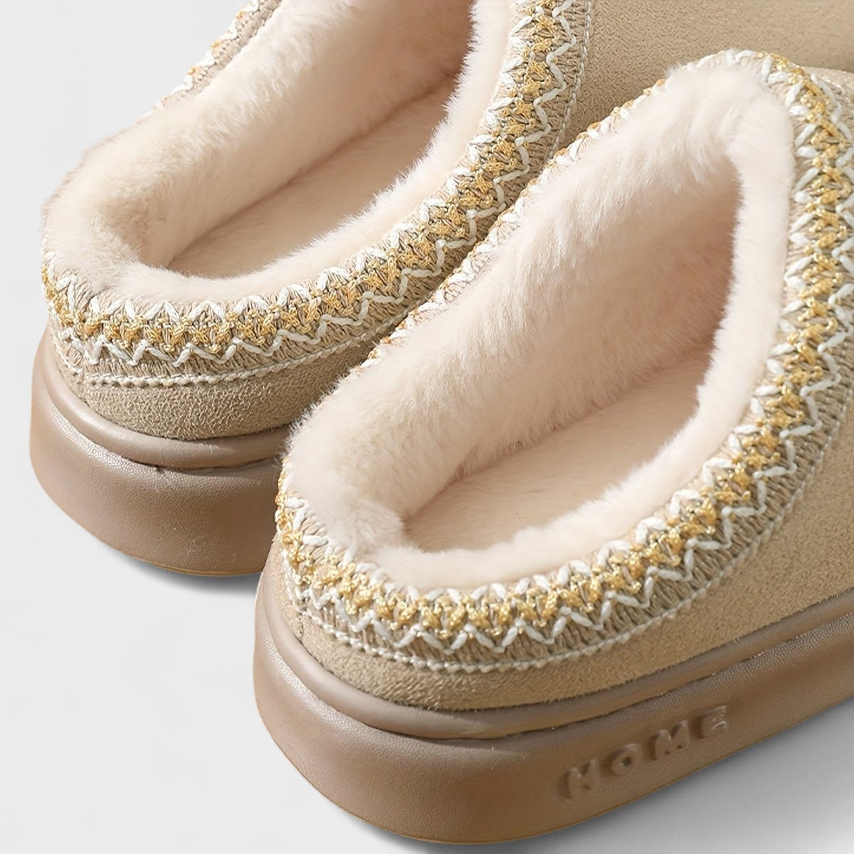 Design elegante e artesanal — detalhes cuidadosamente trabalhados que elevam o look das pantufas.
