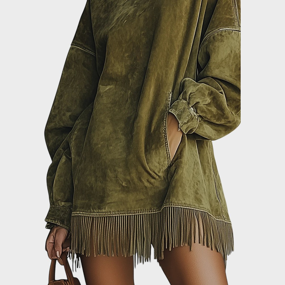 - Diseño sofisticado y elegante: El vestido Sheri está confeccionado en ante, con un tacto suave y sofisticado, perfecto para quienes buscan un look moderno y refinado. El fleco en el bajo le añade un toque único y con estilo.