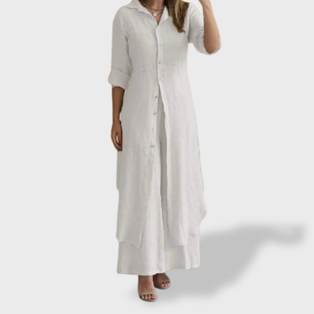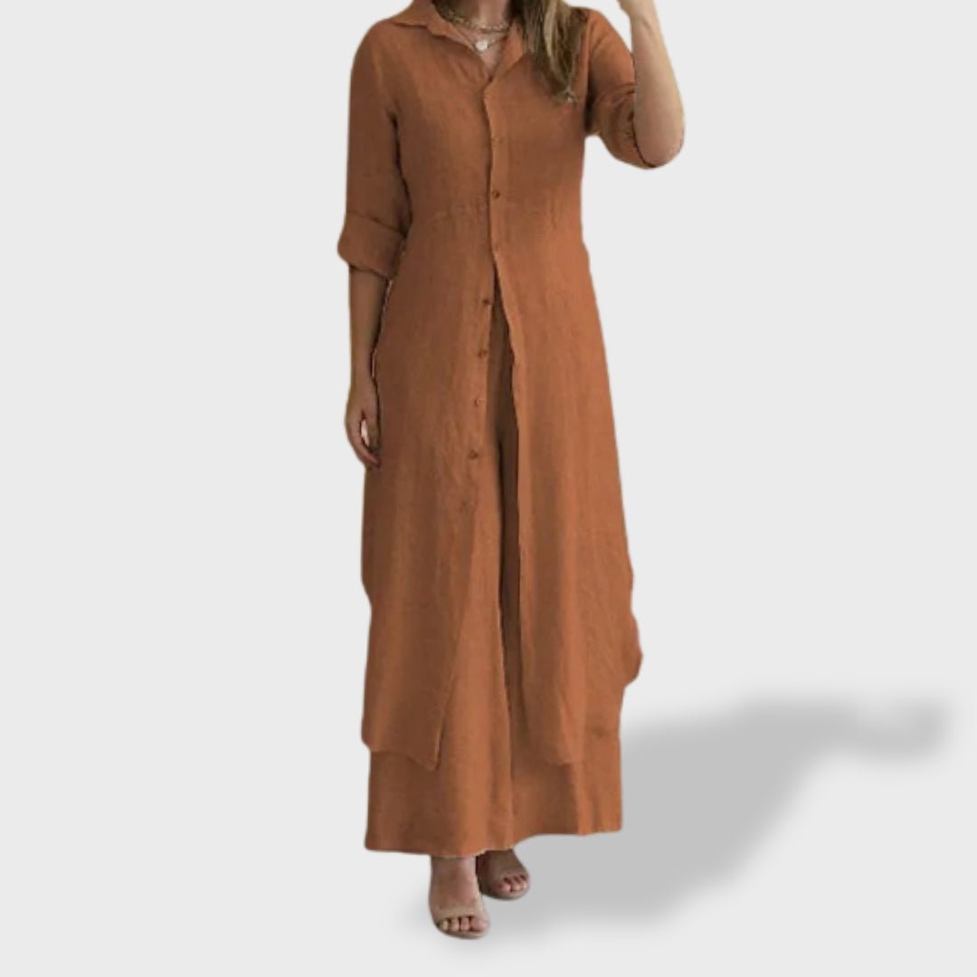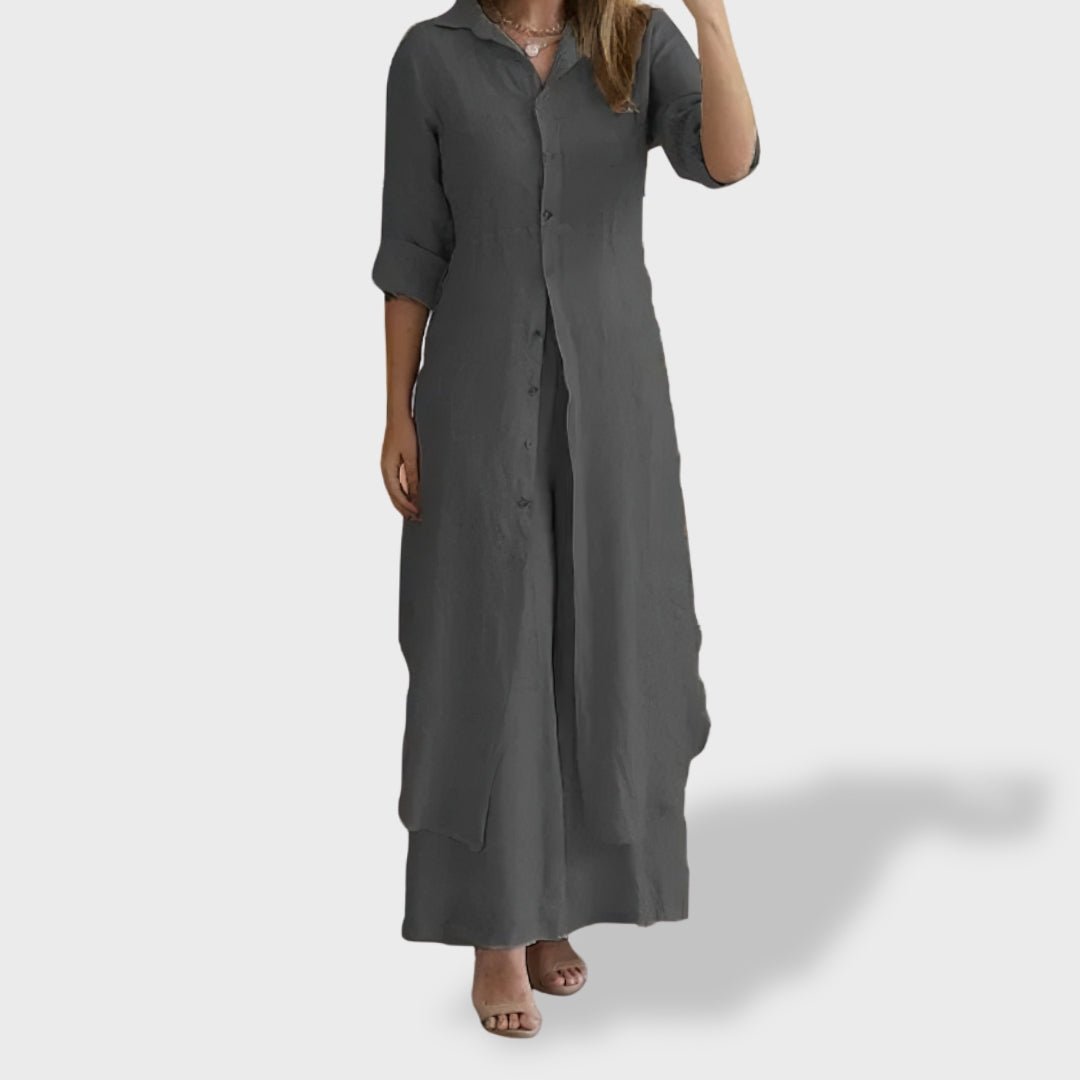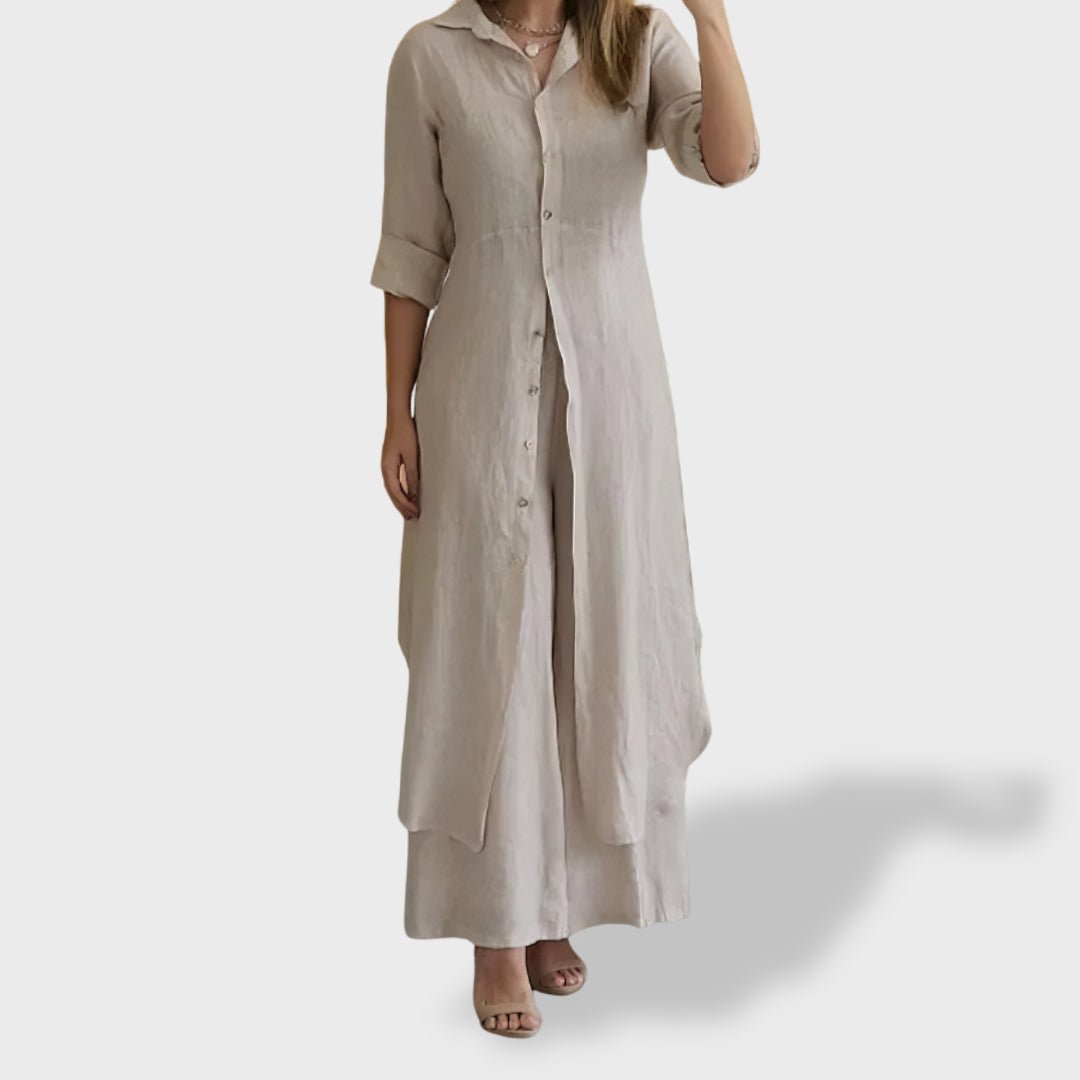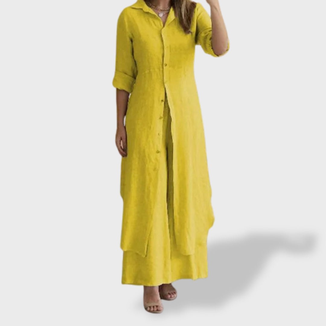 O Norellia™ é o conjunto curto ideal para quem procura frescura com classe nos dias mais quentes. Feito num linho suave e respirável, promete um toque leve e fluido que abraça o teu movimento com delicadeza. A camisa descontraída e os calções curtos criam uma silhueta contemporânea e feminina — perfeita para escapadelas tranquilas, passeios ou um dia descontraído com charme.